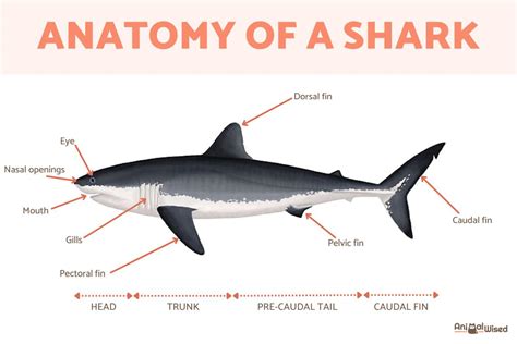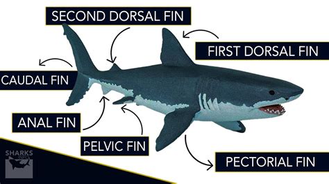 Sharks have several fins that help them swim through the water. Draw a large triangular fin on the top of the shark's body. Next, draw two smaller triangular fins on each side of the body. These will be the side fins. Finally, draw a small triangular fin on the bottom of the shark's body. This is the tail fin.